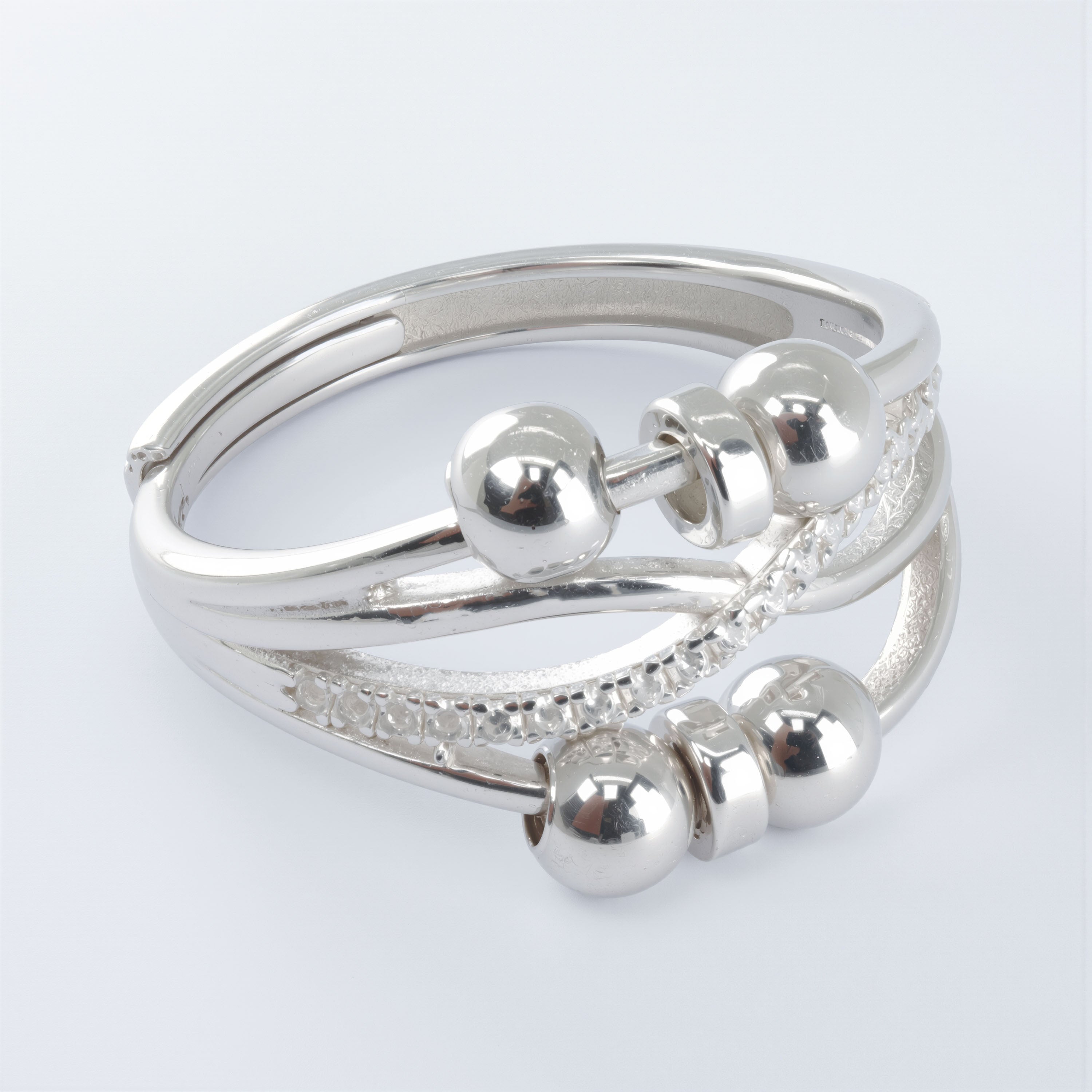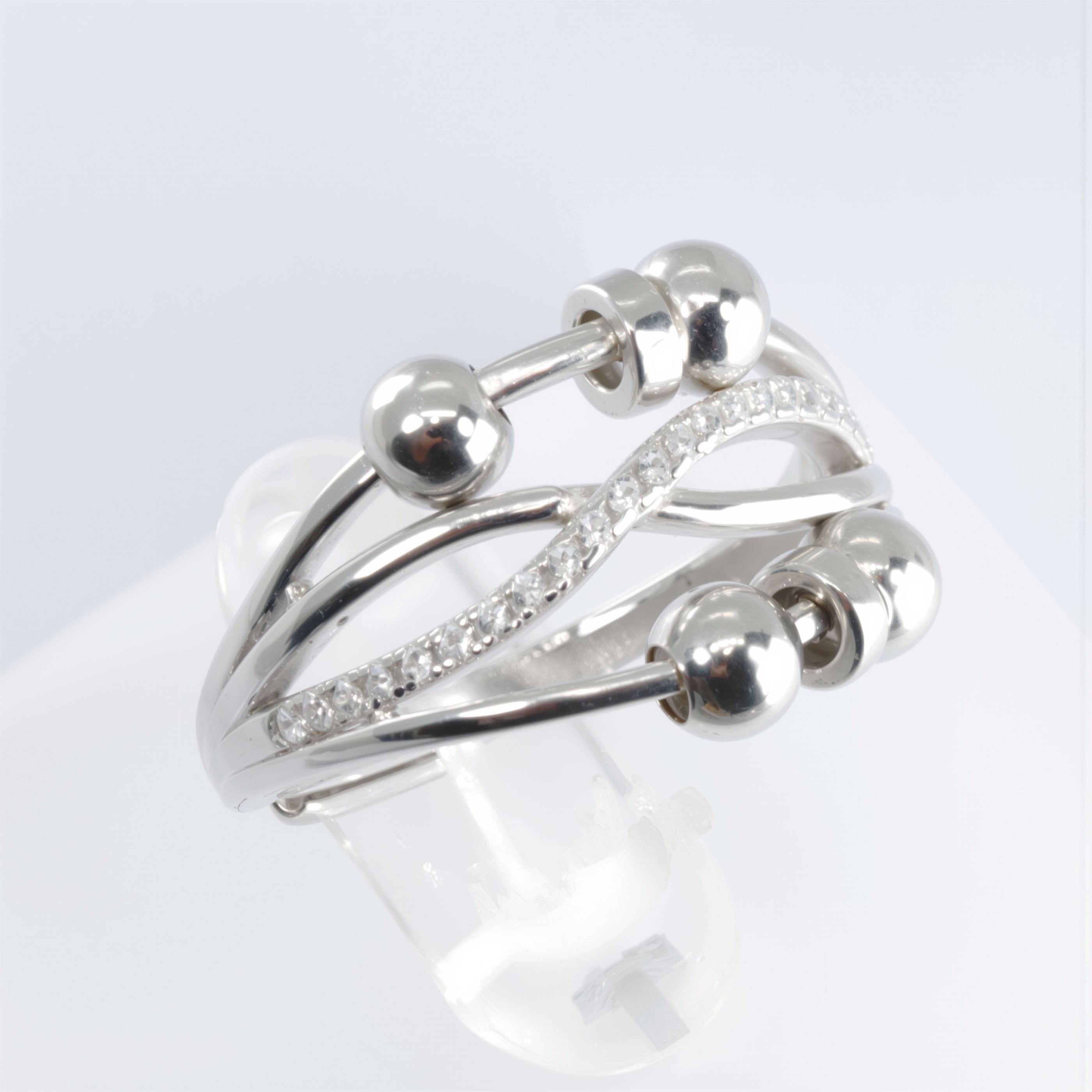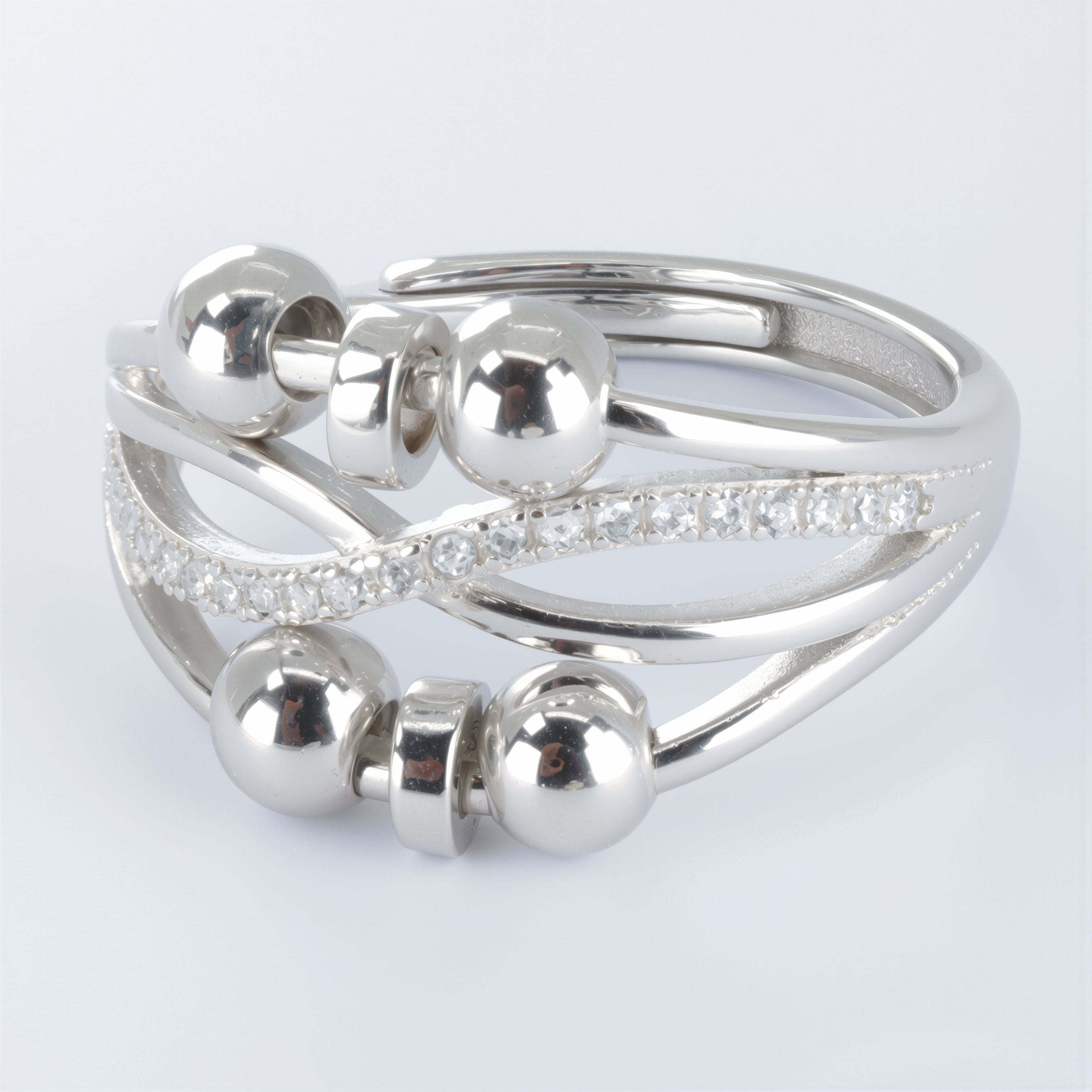 Pierścionek antystresowy ze srebra 925, który łączy subtelny blask cyrkonii z płynnym ruchem delikatnych kulek i krążków, tworząc biżuterię, która zachwyca nie tylko wyglądem, ale też funkcją wyciszającą. Jego stylowy, lekko falujący kształt podkreśla smukłość dłoni, a wysadzany cyrkoniami pasek dodaje mu szlachetnej świetlistości.