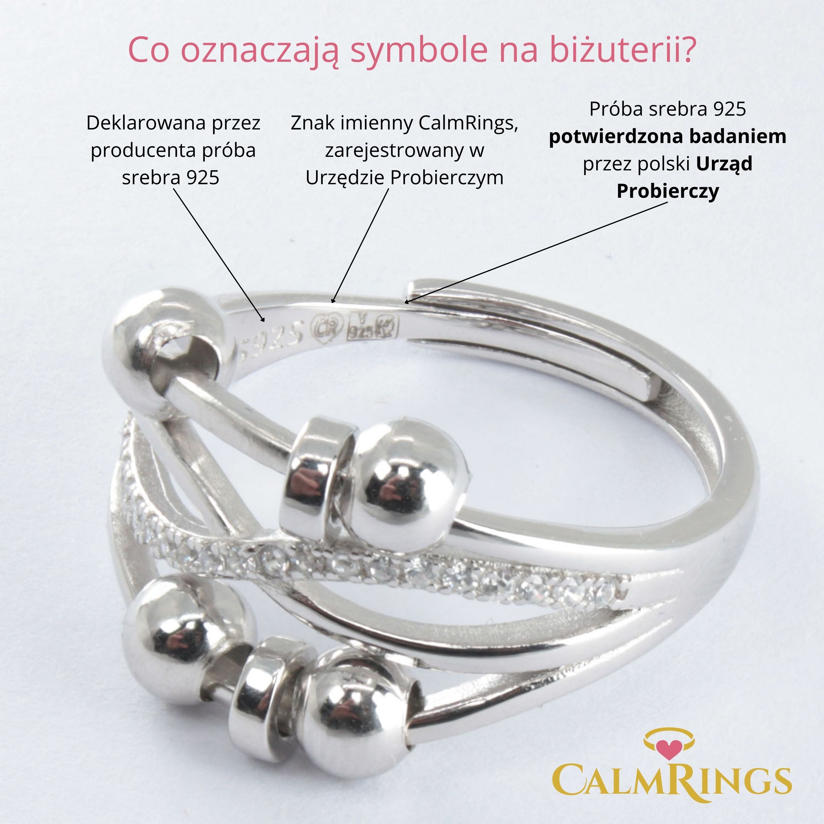 Każdy srebrny pierścionek CalmRings wykonany jest z prawdziwego srebra próby 925, ocechowany przez Polski Urząd Probierczy i oznaczony znakiem imiennym CR w serduszku (nr ewidencyjny: 13 757). Masz pewność, że wybierasz produkt najwyższej jakości.