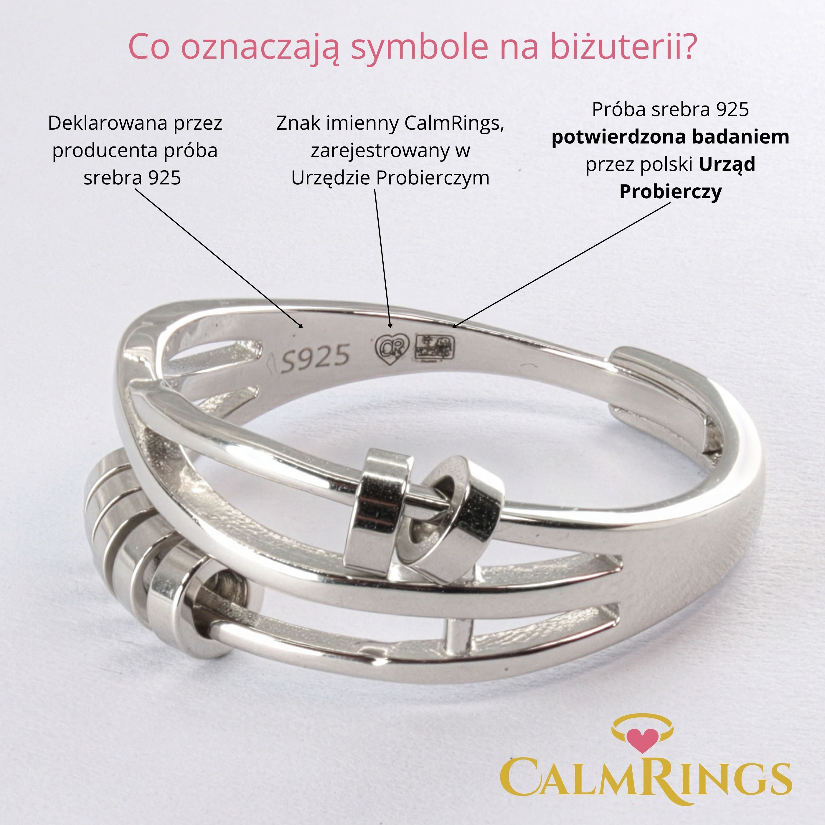 Każdy srebrny pierścionek CalmRings wykonany jest z prawdziwego srebra próby 925, ocechowany przez Polski Urząd Probierczy i oznaczony znakiem imiennym CR w serduszku (nr ewidencyjny: 13 757). Masz pewność, że wybierasz produkt najwyższej jakości.