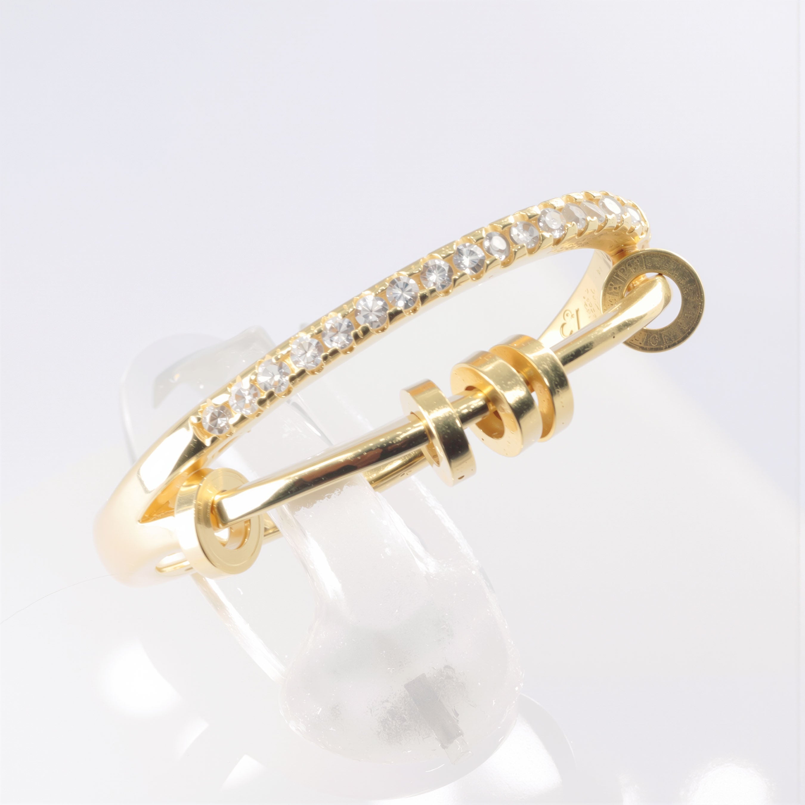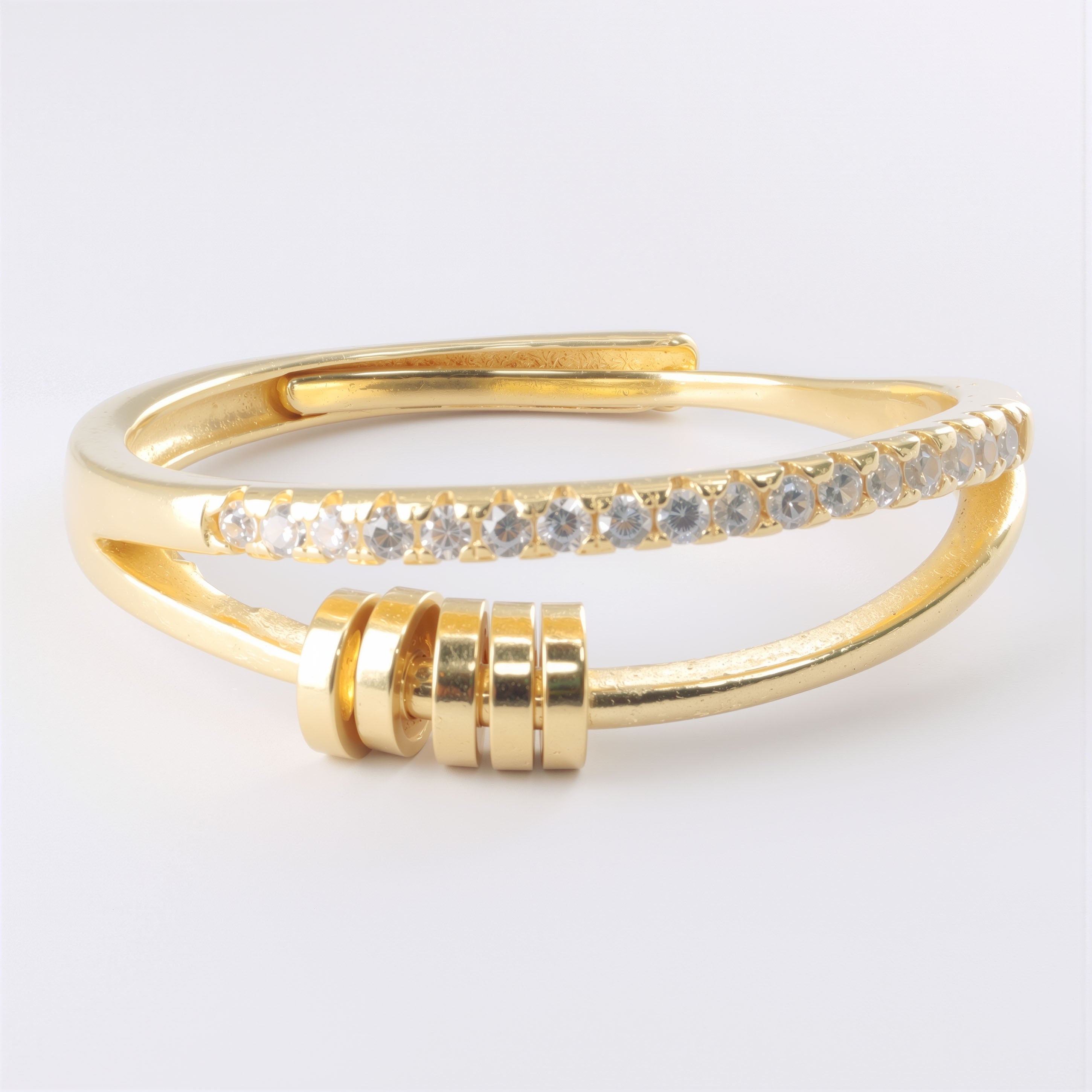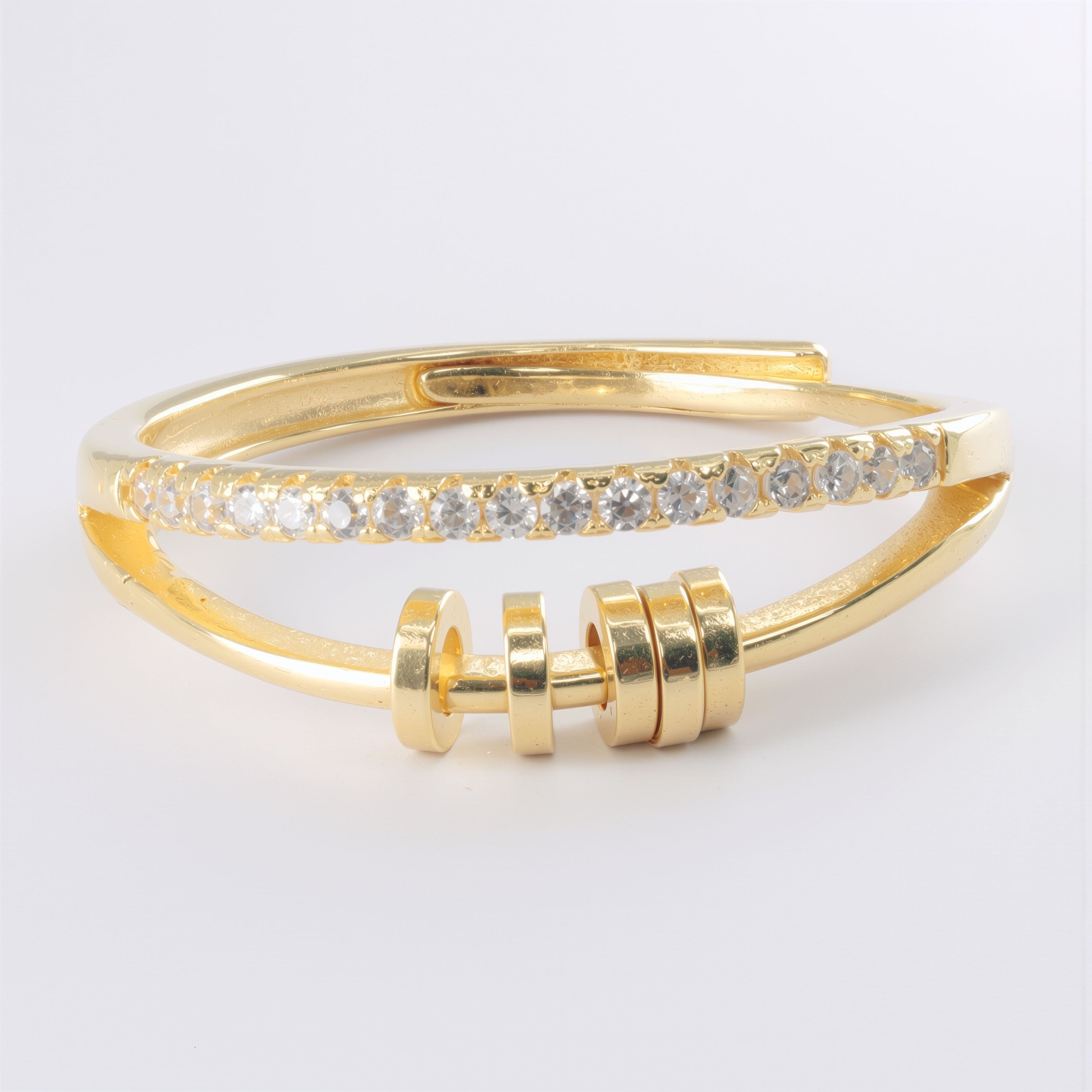 Rząd drobnych, błyszczących cyrkonii dodaje subtelnego blasku, a ruchome krążki tworzą delikatny, wyciszający ruch, który pozwala odprężyć dłonie i umysł.