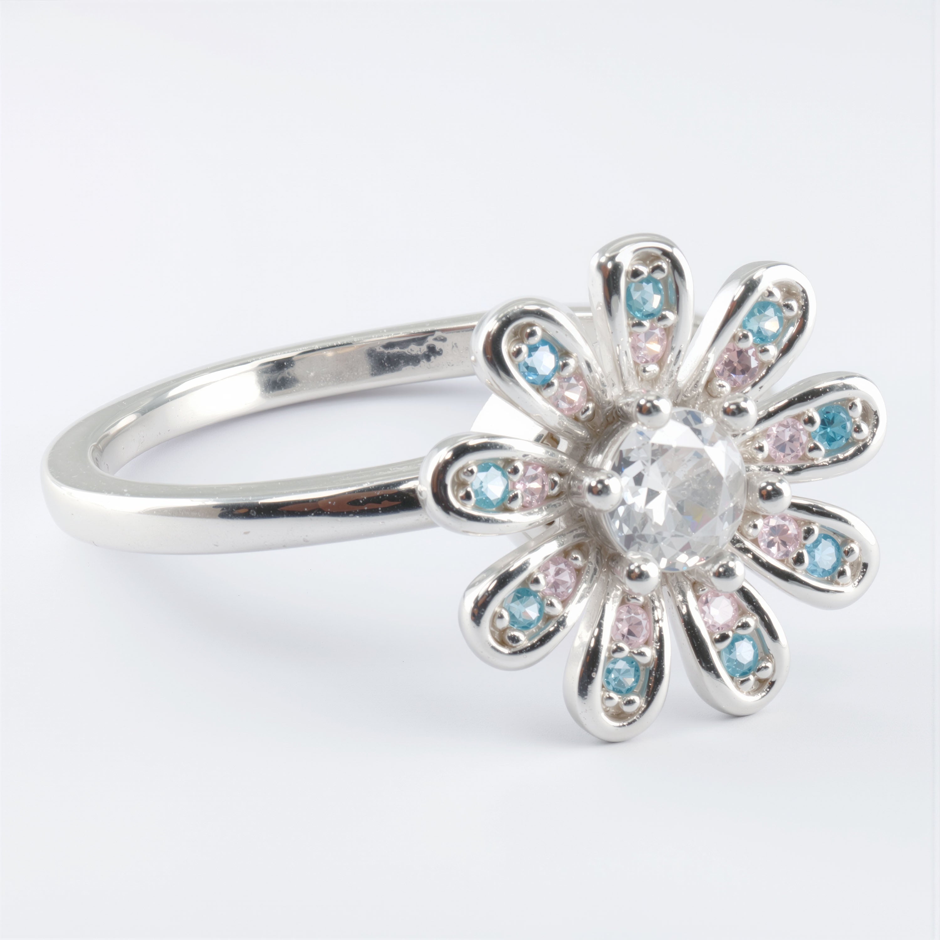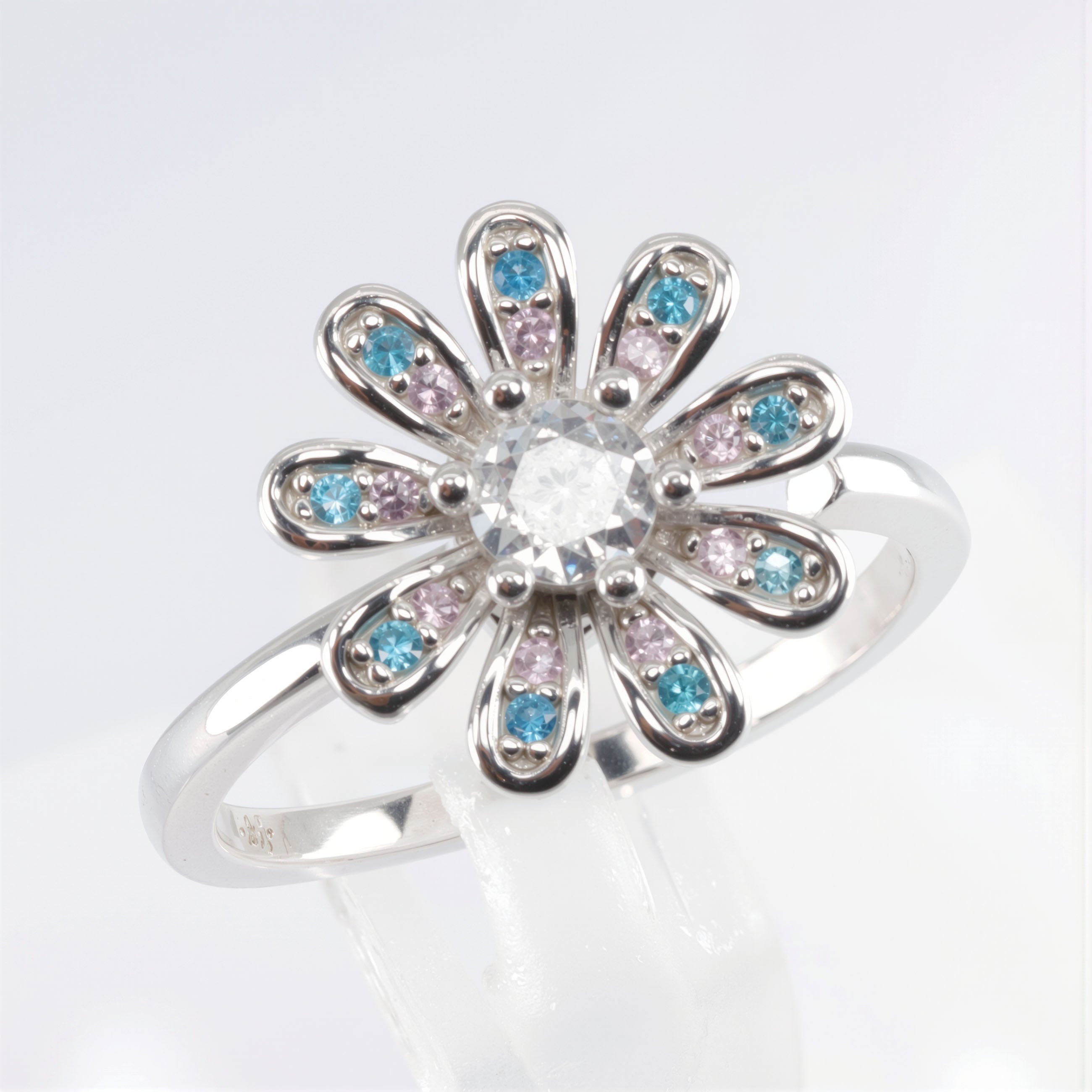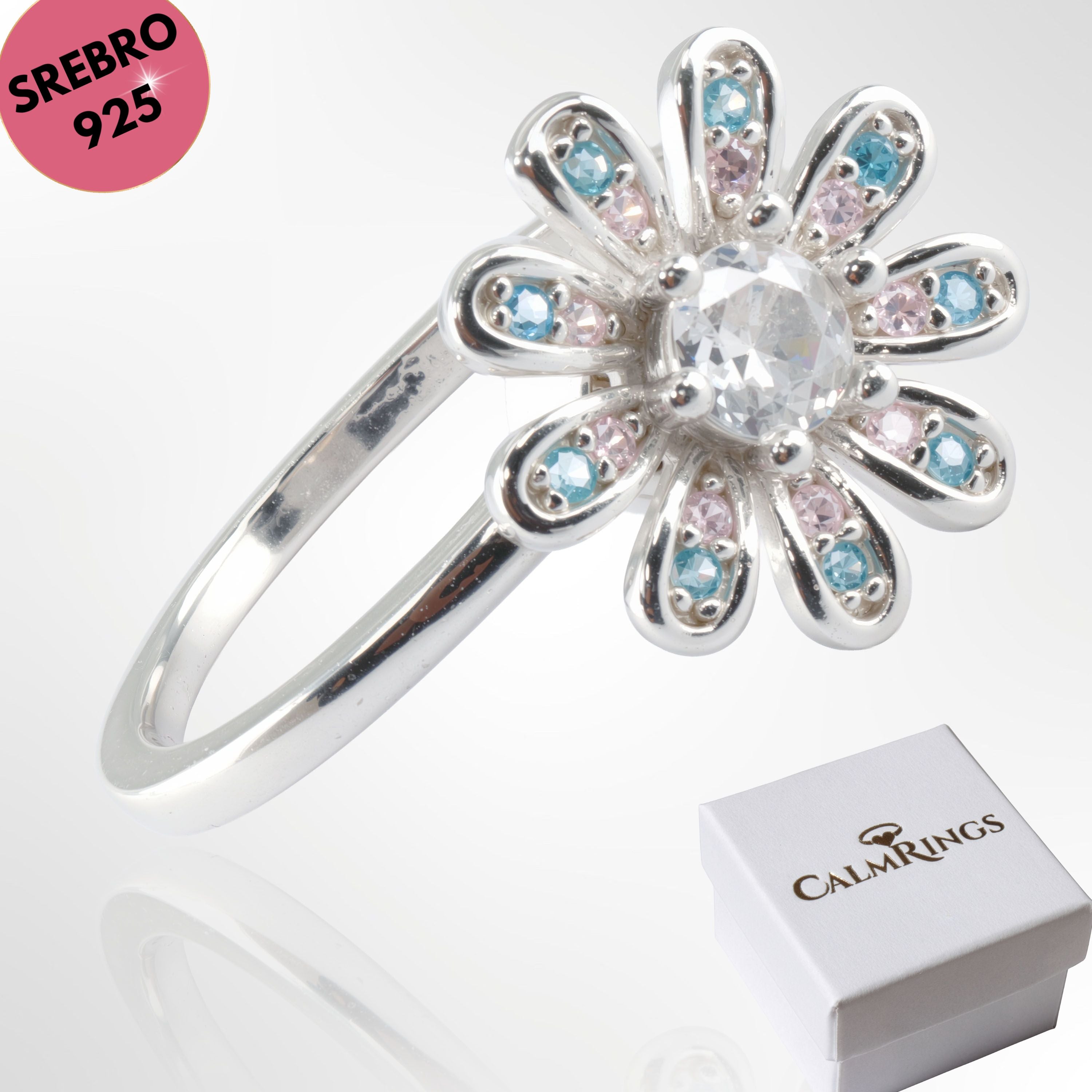 Pozwól sobie na chwilę wytchnienia w samym środku intensywnego dnia. Nasz najnowszy pierścionek antystresowy to połączenie jubilerskiego kunsztu z funkcją relaksacyjną, która pomaga odzyskać równowagę w subtelny i elegancki sposób. Delikatny motyw kwiatuszka, ozdobiony błękitnymi i różowymi cyrkoniami, skrywa w sobie obrotowy mechanizm typu spinner. To Twoje osobiste narzędzie do walki ze stresem, które masz zawsze przy sobie.